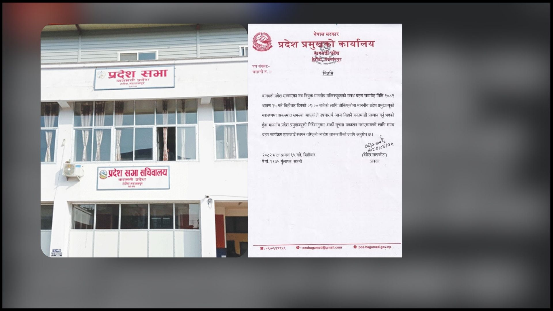 रामेछाप । बागमती प्रदेश सरकारका नवनियुक्त मन्त्रीहरूको आज बिहीबारका लागि तय गरिएको शपथग्रहण कार्यक्रम अनिश्चितकालका लागि स्थगित गरिएको छ । शपथग्रहण कार्यक्रम आज दिउँसो १ बजेका लागि तय गरिएको थियो। तर प्रदेश प्रमुख दिपकप्रसद देवकोटा स्वास्थ्यमा समस्या देखाए आज बिहानै काठमाडौं हिँडेपछि शपथग्रहण कार्यक्रम रोकिएको हो ।उनी आज बिहानै उपचारका लागि काठमाडौं हिँडेको प्रदेश प्रमुखको कार्यालयले जनाएको छ ।बुधबार भएको काँग्रेस संसदीय दलको निर्वाचनमा मुख्यमन्त्री लामालाई पराजित गर्दै इन्द्रबहादुर बानियाँ संसदीय दलको नेता बनेका छन् । बानियाँले २२ मत प्राप्त गरेका छन् भने लामाको पक्षमा १४ मत परेको छ । त्यस्तै एक मत बदर भएको थियो ।संसदीय दलको नेतामा पराजित भएपछि प्रतिक्रिया दिदै मुख्यमन्त्री लामाले संबिधानमै दुई बर्षसम्म सरकार परिवर्तन गर्न नपाइने व्यवस्था रहेको बताउदै राजीनामा दिन अस्वीकार गरेपछि नयाँ विवाद शुरु भएको छ ।