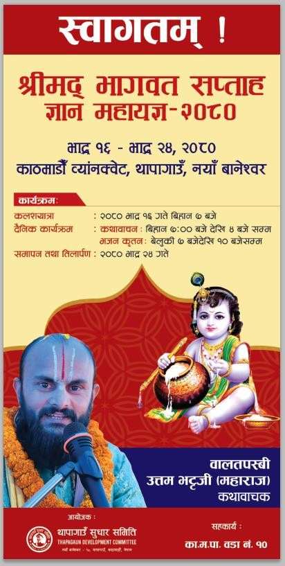 काठमाडौ ! राष्ट्रदेव भगवान श्रीपशुपतिनाथका असिम अनुकम्पाले काठमाडौ महानगरपालिका वडा न १०,नयाँ बानेश्वर,थापागाउँस्थित थापागाउँ पलान्चोक भगवती मन्दिरमा साझ बिहान पूजाअर्चना र भजनकीर्तनको माध्यमबाट वातावरणलाई स्वस्थ्य,स्वच्छ र सफा राखी अनवरत रुपमा मन्दिर सन्चालनको लागी अक्षयकोष स्थापनार्थ थापागाउँ सुधार समितिको सत्सकल्पमा बालतपस्वि पण्डित श्री उत्तम भट्ट महाराजज्युका मुखारबिन्दबाट हुन गइरहेको संगीतमय श्रीमद भागवत सप्ताह ज्ञान् महायज्ञ यहि भाद्र १६ गते बिहान ७ बजेबाट कलश यात्राबाट प्रारम्भ भइ २४ गते तिलार्पण गरि समापन हुने,महायज्ञ मूल समितिका संयोजक दिपक थापाले जानकारी गराउनु भयो । सात दिन सम्म चल्ने महायज्ञमा कथावाचन बिहान ७ बजे देखि बेलुकी ४ बजे सम्म हुने र बेलुकी ७ बजे देखि १० बजे सम्म भजन कृतन हुने स्थानिय युवा तथा महायज्ञ मुल समितिका सदस्य शशी थापाले बताउनु भयो ।